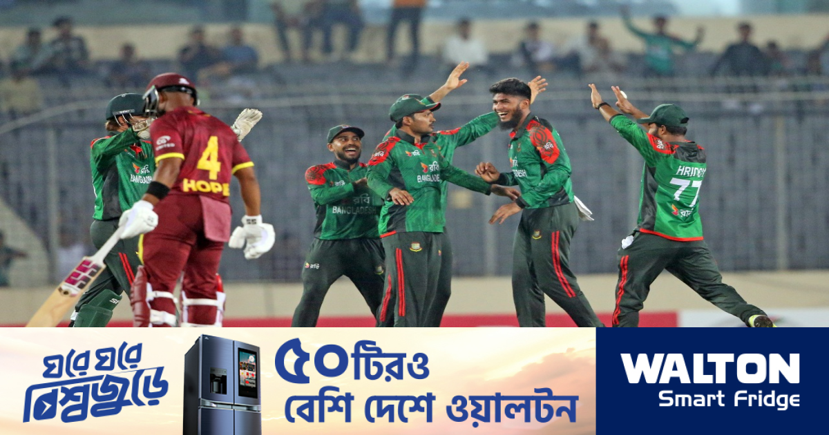 এরপর মিরাজ-তানভির ও মুস্তাফিজ ওয়েস্ট ইন্ডিজের ইনিংস বড় হতে দেননি। তারা শেষ পর্যন্ত অল আউট হয়ে যায় ১৩৩ রানে। ফলে ৭৪ রানের হার নিয়ে মাঠ ছাড়তে হয় ক্যারিবীয়দের। জেইডেন সিলসকে মিরাজের ক্যাচ বানিয়ে ওয়েস্ট ইন্ডিজের ইনিংসও গুড়িয়ে দিয়েছেন রিশাদ। তিনি ৩৫ রানে ৬ উইকেট নিয়ে ম্যাচ শেষ করেছেম। এই জয়ের ফলে ৩ ম্যাচের সিরিজে ১-০ ব্যবধানে এগিয়ে গেছে স্বাগতিক বাংলাদেশ।
