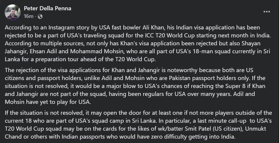 যুক্তরাষ্ট্রের সাংবাদিক পিটার ডেলা জানিয়েছেন ভিসা না পাওয়া ক্রিকেটারদের তালিকা আছেন আরও ৩জন। তারা হলেন শায়ান জাহাঙ্গীর, এহসান আদিল ও মোহাম্মদ মহসিন।