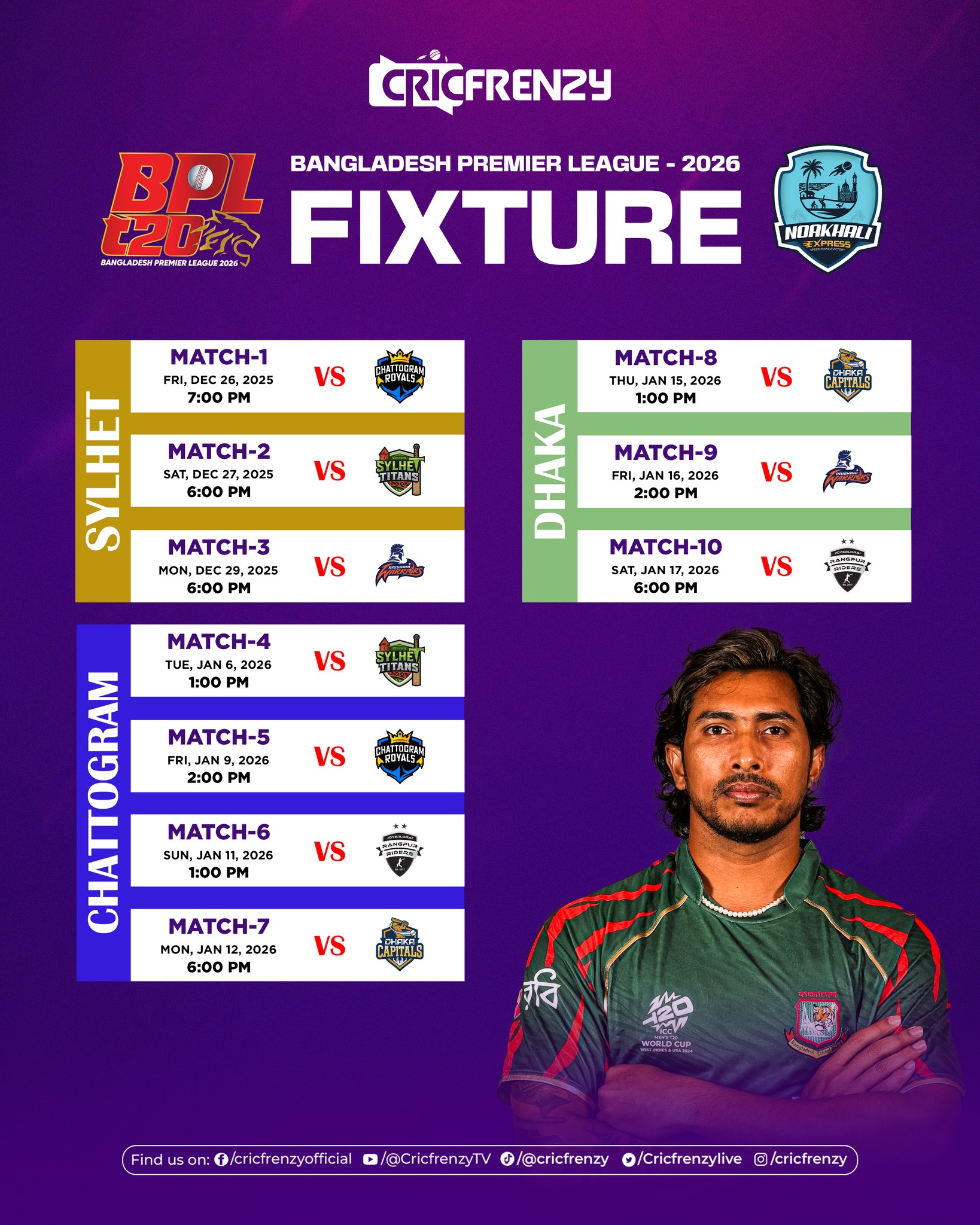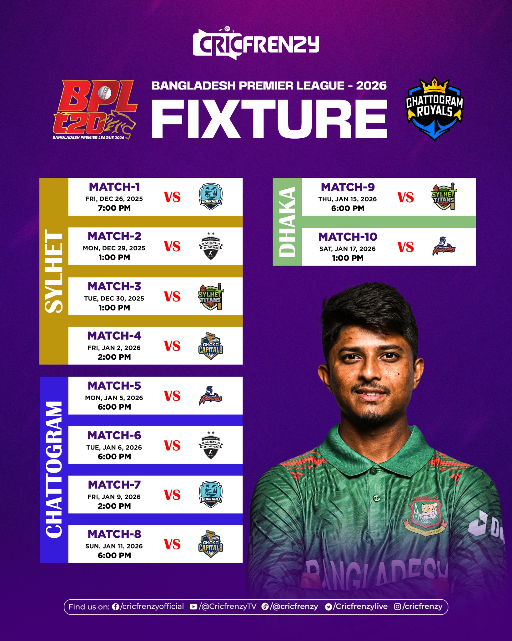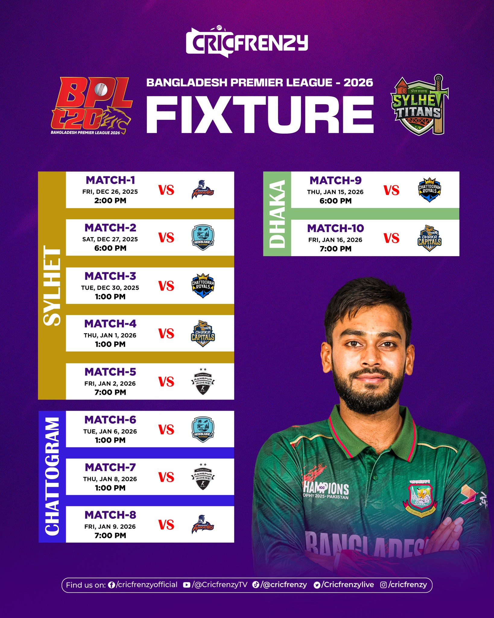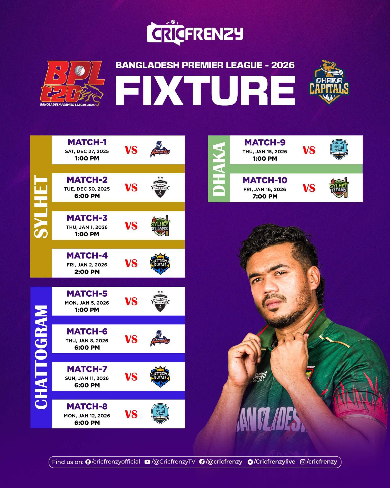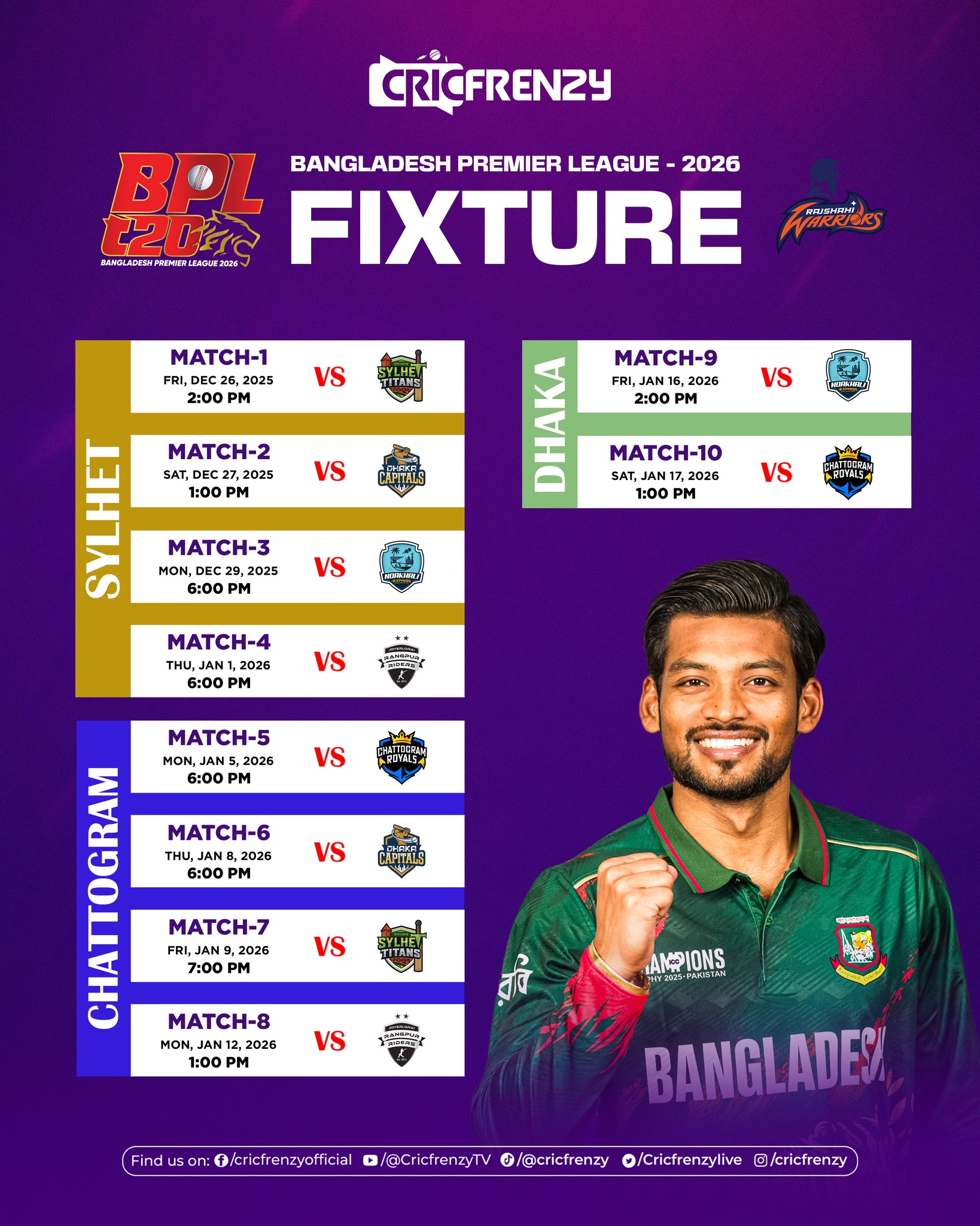 Sylhet will host the opening phase, starting with Sylhet Titans facing Rajshahi Warriors in the tournament opener and later that day Noakhali Express vs Chattogram Royals.
