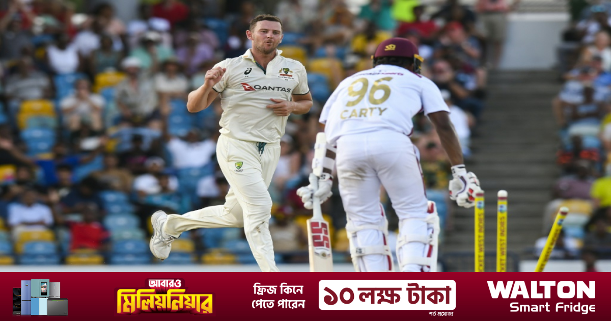 Hazlewood returned to the attack to prise out Jomel Warrican but Shamar Joseph entertained with 44 off 22 balls before falling to off-spinner Nathan Lyon, who then dismissed Jayden Seales first ball to complete victory with two days to spare. Justin Greaves was left unbeaten on 38.