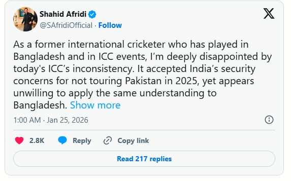 Afridi shared his frustration on social media platform X, questioning the ICC’s approach and highlighting what he sees as a double standard by comparing India’s decision not to tour Pakistan in 2025 with the situation now faced by Bangladesh.
