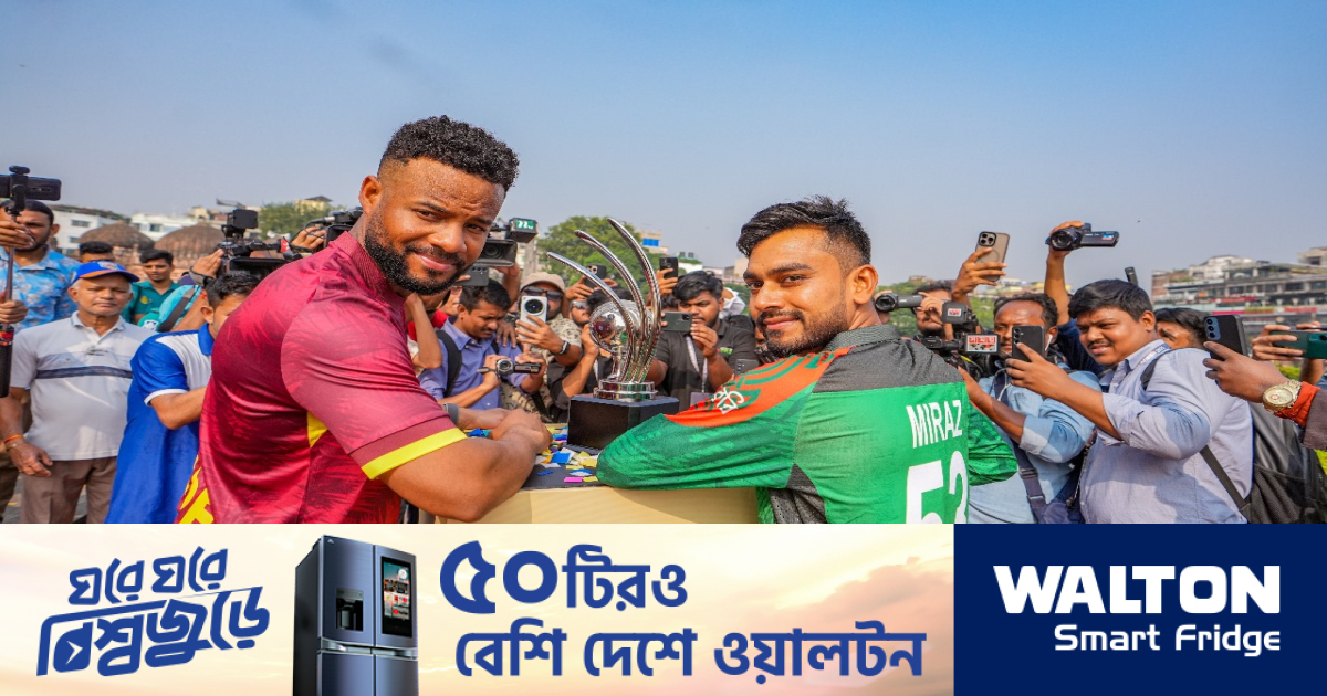 লাল সবুজের জার্সি গায়ে জড়িয়ে লালবাগ কেল্লায় তখন অপেক্ষা করছিলেন মেহেদী হাসান মিরাজ। ওয়েস্ট ইন্ডিজ অধিনায়ক শাই হোপ তখনো এসে পৌঁছাননি। একটু দেরি হলেও তিনি এলেন। লোহার কলাপসিবল ফটক খুলে দিতেই ভেতরে ঢুকলেন হোপ। চারপাশে তখন গণমাধ্যমের ক্যামেরার ছড়াছড়ি। কেউ ছবি তুলছেন আবার কেউ সেটাকে ভিডিও করছেন। সাপ্তাহিক ছুটির দিন—তবুও ট্রফি উন্মোচন করতে দর্শনার্থীতে আসার সুযোগ ছিল না একদমই। নিরাপত্তাকর্মীরাও নিজেদের দায়িত্ব পালনে তখন ব্যস্ত।