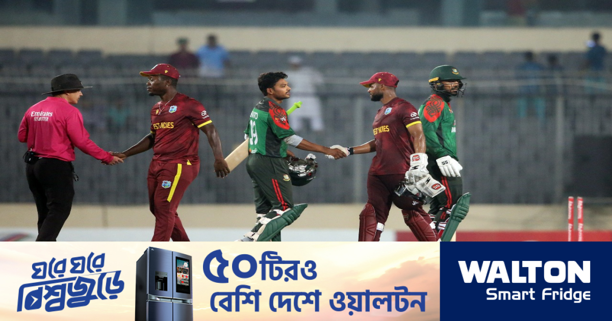 এর আগে এই ম্যাচে টানা ৫০ ওভার স্পিনারদের দিয়ে বোলিং করিয়ে রেকর্ডে নাম লেখায় পেস বোলারদের আঁতুড়ঘর হিসেবে খ্যাত ওয়েস্ট ইন্ডিজ। তাদের স্পিন আক্রমণ সামলেই রিশাদ হোসেনের দারুণ এক ক্যামিওতে ৭ উইকেটে ২১৩ রানের পুঁজি পায় বাংলাদেশ। ওয়েস্ট ইন্ডিজও সমানে সমান টক্কর দিয়েছে। তবে ম্যাচ জিততে পারেনি। টাই করেই শুরুতে সন্তুষ্ট থাকতে হয় তাদের। তারা ৫০ ওভার শেষে ৮ উইকেটে ২১৩ রান সংগ্রহ করে।