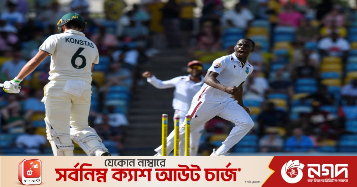 ওয়েস্ট ইন্ডিজের চেয়ে ১০ রানে পিছিয়ে থেকে ব্যাটিংয়ে নামে অস্ট্রেলিয়া। ইনিংসের শুরুতে দু’বার জীবন পেলেও সেটা কাজে লাগাতে পারেননি কনস্টাস। অনেকটা সময় উইকেটে পড়ে থেকে ৩৮ বলে ৫ রান করে শামার জোসেফের বলে বোল্ড হয়ে ফেরেন ডানহাতি এই ব্যাটার। আরেক ওপেনার খাওয়াজা আউট হয়েছেন আগেই। আলজারি জোসেফের বলে লেগ বিফোর হয়েছেন তিনি।