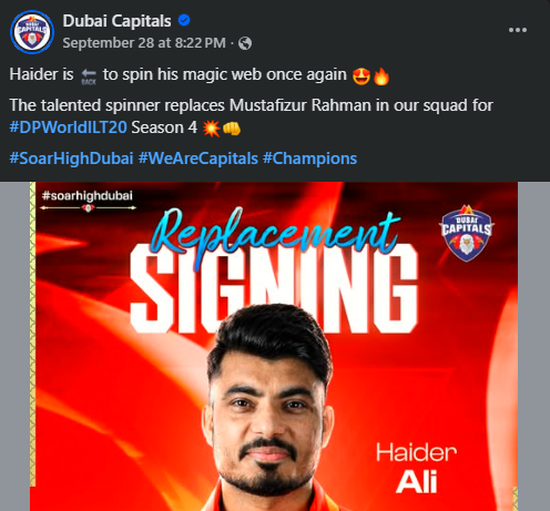 In his place, the franchise has confirmed the inclusion of young spinner Haider Ali.